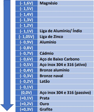 Os metais de menor potencial elétrico (menos nobres) são os que se corroem primeiro, protegendo os de maior potencial (mais nobres).